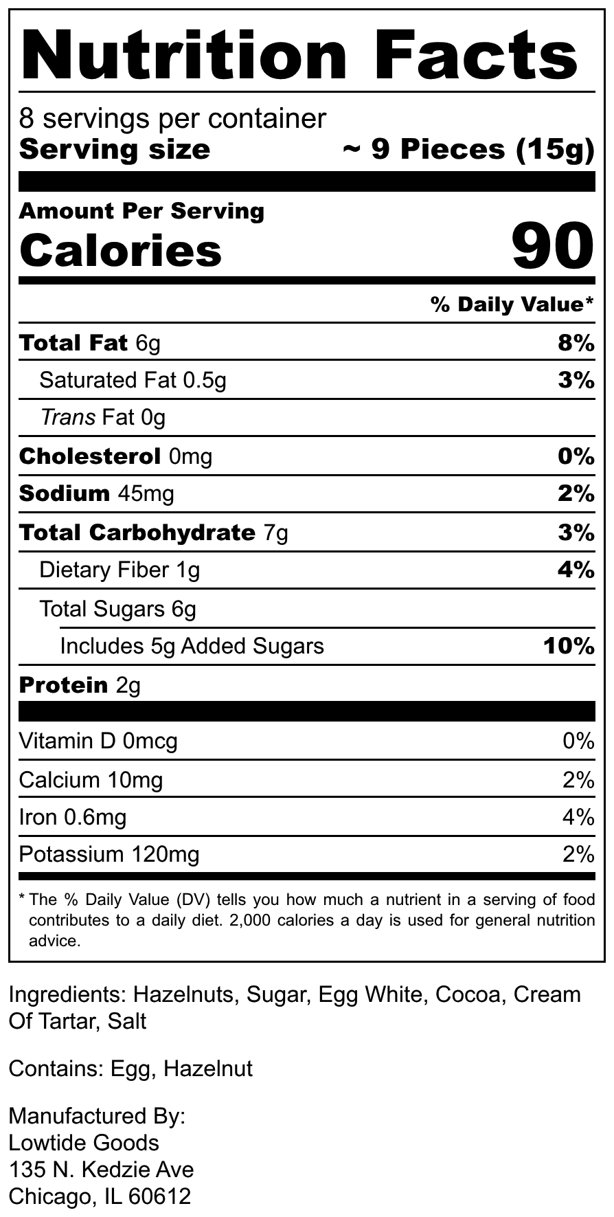 Ingredients: Hazelnuts, Sugar, Egg White, Cocoa, Cream of Tartar, Salt