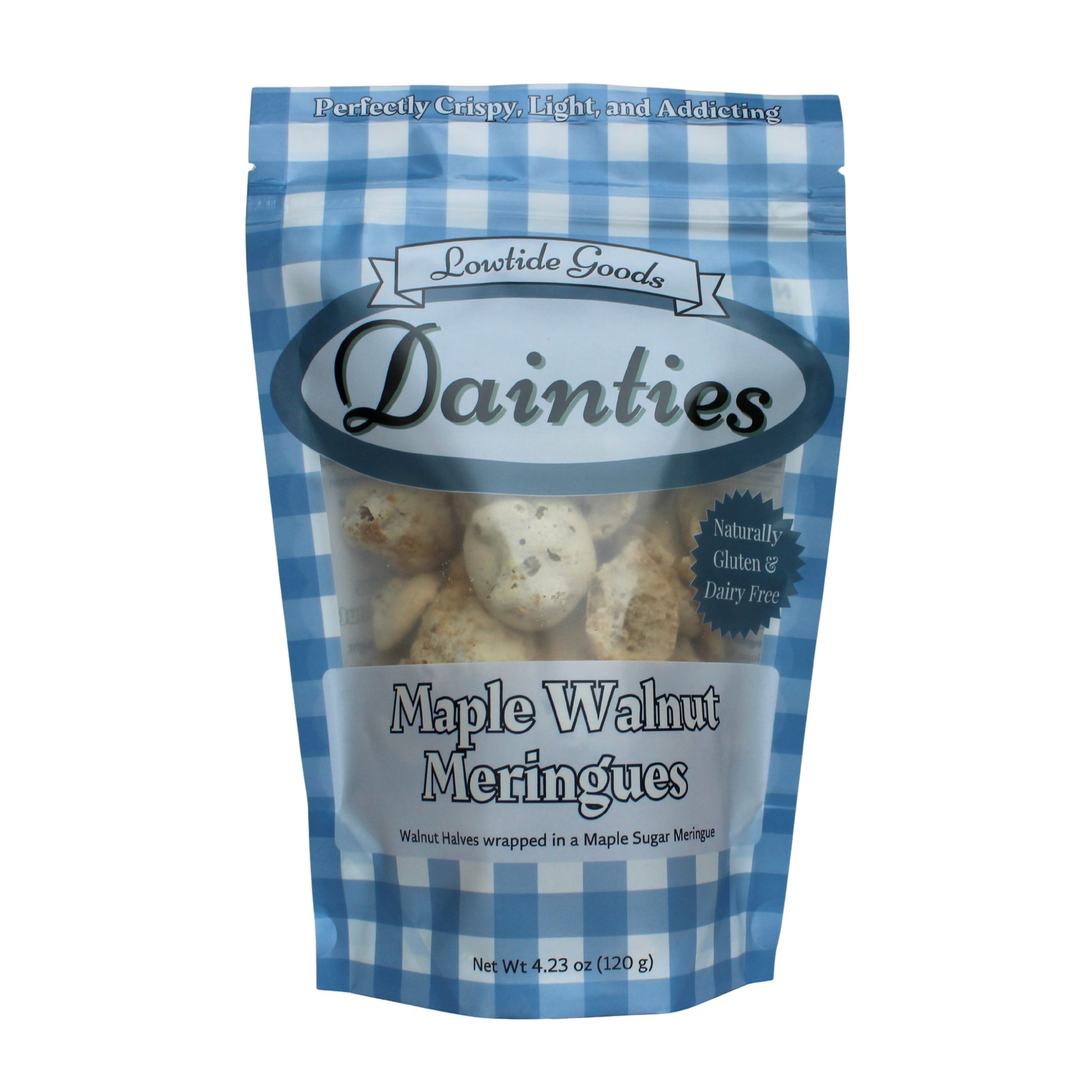 Walnut Halves, Real Maple Sugar, and Sea Salt in a Crispy Meringue.